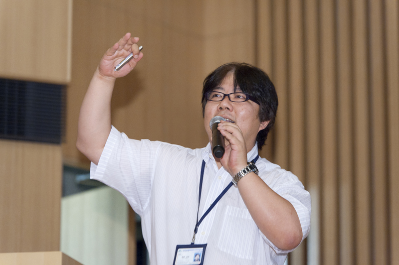 続けて、2ヶ所の会場に分かれ、ブース展示のうち23の研究シーズ・研究成果について、出展担当教員が出展内容や研究を紹介するミニ講演が実施され、聴講者は延べ約1,050名となりました。今年度は、国民との科学・技術対話の推進が求められる「最先端・次世代研究開発支援プログラム」、また3月に整備されたグリーンビークル材料研究開発拠点について、それぞれ5名の講師が特別枠として連続で講演を行いました。各ミニ講演には、聴講者が多数詰めかけ、活発な質疑応答や、熱心にメモをとる姿などが見受けられました。